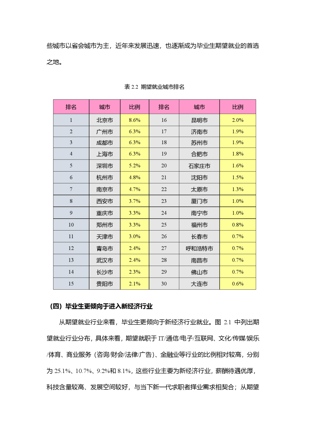 《报告》显示,从期望就业行业来看,毕业生更倾向于新经济行业就业。具体来看,期望就职于IT/通信/电子/互联网、文化/传媒/娱乐/体育、商业服务(咨询/财会/法律/广告)、金融业等行业的比例相对较高,分别为25.1%、10.7%、9.2%和8.1%,这些行业主要为新经济行业,薪酬待遇优厚,科技含量较高、发展空间较好,与当下新一代求职者择业需求相契合。