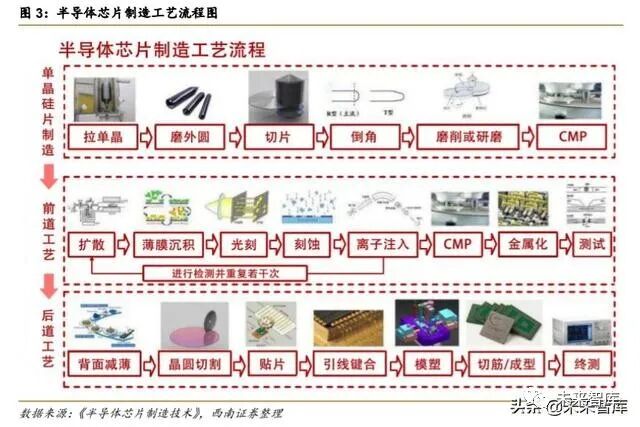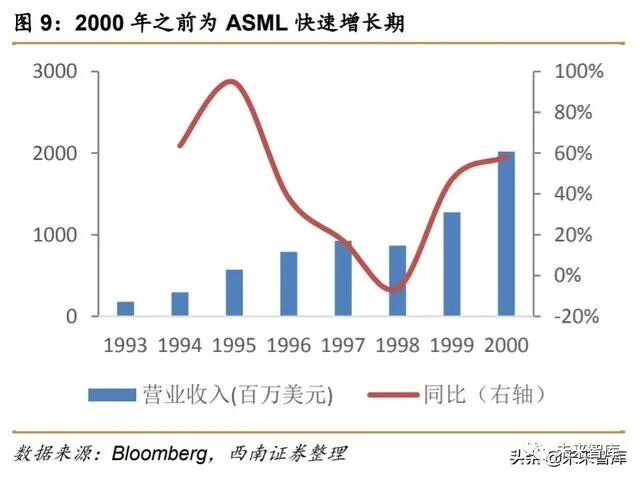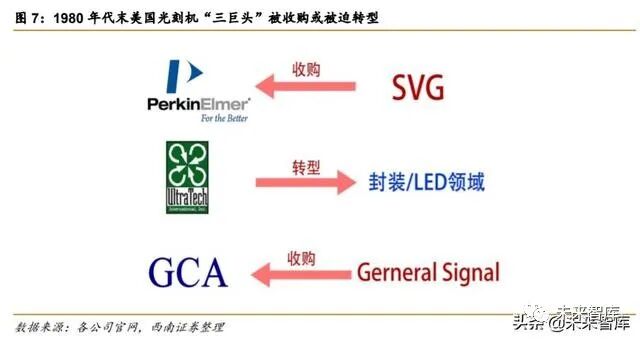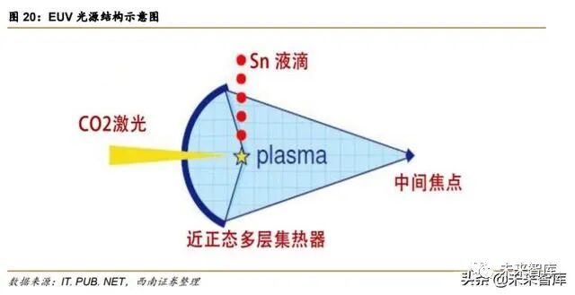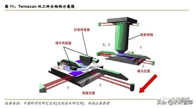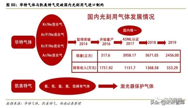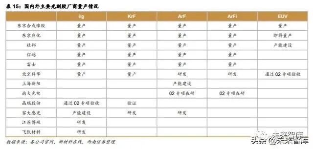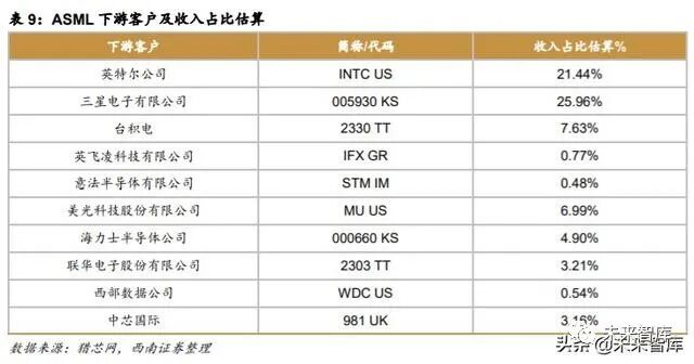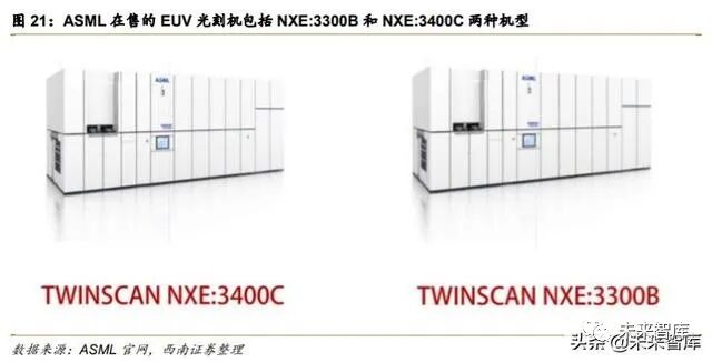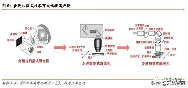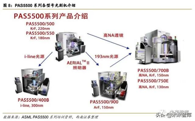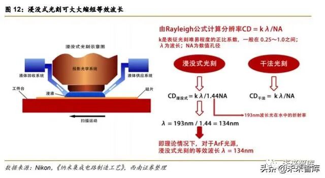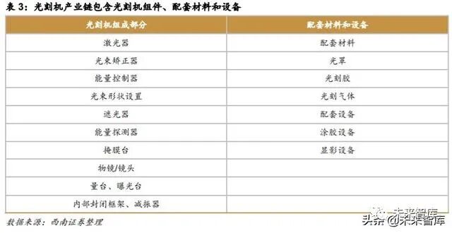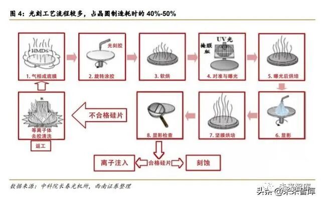 1、提要:光刻工艺是晶圆制造最核心环节,光刻产业链协同发展成为光刻机突破关键因子 1.1 光刻定义晶体管尺寸,光刻工艺合计占芯片成本近 30% 2019 年全球半导体市场规模达 4090 亿美元,成为数码产业的基石。第二次工业革命就 是数码产业的革命,据麦肯锡预测,2020 年全球数码产业将占全球企业总产值的 41%,而 半导体则成为数码产业的基石。根据 WSTS 统计,2019 年全球半导体市场份额达 4090 亿 美元,其中集成电路占比达 81%,集成电路中的逻辑 IC 和存储器是推动摩尔定律发展的主 要力量,两者合计占半导体整体市场规模的 52%,市场规模达 2127 亿美元。 半导体产业链分为设计、制造、封测三大环节,设备成为半导体产业支柱。芯片设计主 要根据芯片的设计目的进行逻辑设计和规则制定,并根据设计图制作掩模以供后续光刻步骤 使用。芯片制造实现芯片电路图从掩模上转移至硅片上,并实现预定的芯片功能,包括光刻、 刻蚀、离子注入、薄膜沉积、化学机械研磨等步骤。芯片封测完成对芯片的封装和性能、功 能测试,是产品交付前的最后工序。半导体设备贯穿设计、制造、封测三大流程,成为半导 体产业的支柱。据 Semi 统计,2019 年全球半导体设备市场达 597.4 亿美元,设备投资占晶 圆厂整体资本支出的 70%-80%,其中用于芯片制造的设备占半导体设备总支出的 81%。 14nm 及以下先进制程应用广泛且不断进步,光刻、刻蚀、沉积设备成为投资重点。晶 体管线宽在 28nm 以内的称为先进制程,目前台积电、三星两家晶圆厂最先进工艺可将制程 推进到 5nm 级别,其中台积电为全球最大晶圆代工厂,全球代工市占率达 50.5%,2019 年 台积电 28nm 以内制程收入占比达 67%,其中 16nm(与三星、中芯国际 14nm 处于同一竞 争序列)及以内制程收入贡献达 50%。受益于高压驱动、图像传感器、射频等应用的需求增 加,根据 IHS Markit 统计,28 纳米制程的集成电路晶圆代工市场将保持稳定增长,预计 2024 年全球 市场规模将达到 98 亿美元。14 纳米及以下更先进制程的集成电路晶圆代工市场将 保持快速增长,预计 2024 年全球市场规模将达 386 亿美元,2018 年至 2024 年的复合增长 率将达 19%。 光刻、刻蚀、薄膜沉积设备三大设备成为推动 28nm 及以下先进工艺发展的主要力量, 分别占半导体晶圆处理设备的 23%、24%、18%。 光刻定义了晶体管尺寸,是集成电路生产中的最核心工艺,占晶圆制造耗时的 40%-50%。 光刻工艺是 IC 制造中最关键、最复杂和占用时间比最大的步骤,光刻的原理是在硅片表面 覆盖一层具有高度光敏感性光刻胶,再用光线(一般是紫外光、深紫外光、极紫外光)透过 掩模照射在硅片表面,被光线照射到的光刻胶会发生化学反应。此后用特定显影液洗去被照 射/未被照射的光刻胶,就实现了电路图从掩模到硅片的转移。一般的光刻工艺要经历气相成 底膜、旋转涂胶、软烘、对准与曝光、曝光后烘培、显影、坚膜烘培、显影检查等工序,光 刻工艺占晶圆制造耗时的 40%-50%,光刻机约占晶圆制造设备投资额的 23%,考虑到光刻 工艺步骤中的光刻胶、光刻气体、光罩(光掩膜版)、涂胶显影设备等诸多配套设施和材料 投资,整个光刻工艺占芯片成本的 30%左右。 1.2 区别于其他晶圆制造设备,光刻机独有自身产业链概念 区别于晶圆制造其他工艺,光刻机组件及配套设施复杂,形成自身产业链概念。光 刻机的制造研发并不是某一个企业能够单独完成的,光刻作为晶圆制造过程中最复杂、最 重要的步骤,主要体现在光刻产业链高端复杂,需要很多顶尖的企业相互配合才可以完成。光刻产业链主要体现在两点上,一是作为光刻核心设备的光刻机组件复杂,包括光源、 镜头、激光器、工作台等组件技术往往只被全球少数几家公司掌握,二是作为与光刻机 配套的光刻胶、光刻气体、光罩(光掩膜版)等半导体材料和涂胶显影设备等同样拥有 较高的科技含量。 随着制程精度提升,光刻机复杂程度提高,贯通光刻产业链成为 ASML 垄断光刻市场 的关键。摩尔定律的进步伴随着工艺与设备的双重突破,光刻设备作为推动摩尔定律的核心 设备,截止目前光刻机已经历经五代发展,随着制程精度提升,自身复杂程度也在不断提高, 以 ASML 的 EUV 光刻机为例,7nm 的 EUV 光刻机内部共有 10 万个零件,重达 180 吨,包 含硅片输运分系统、硅片平台分系统、掩膜版输运分系统、系统测量与校正分系统、成像分 系统、光源分系统等 13 个系统,90%的关键设备来自外国而非荷兰本国,ASML 作为整机 公司,实质上只负责光刻机设计与集成各模块,需要全而精的上游产业链作坚实支撑。透视 ASML 的 5000 多个供应商,其中与产品相关的供应商提供直接用于生产光刻系统的材料、 设备、零部件和工具,这个类别包括 790 家供应商,占 ASML 总开支的 66%。 日、美配套光刻胶、光刻气体等材料和设备紧紧追随 ASML 产品迭代。由于 ASML 统 治全球高端光刻市场,众多配套设备材料和设备厂商纷纷追随 ASML 产品的技术工艺。配套 光刻气体方面,美国空气化工产品(APD)、英国林德集团均有相应布局,日本合成橡胶(JSR)、 东京应化、信越化学和富士胶片等日本企业则统治了光刻胶市场,仅有美国杜邦公司有一定 竞争力,其中东京应化已实现极紫外光刻胶量产,日本合成橡胶紫外光刻胶即将量产。配套 设备方面,光刻工序中的涂胶显影设备主要被日本东京电