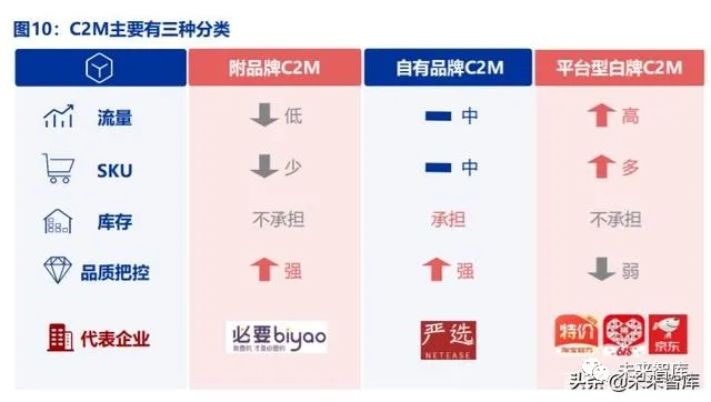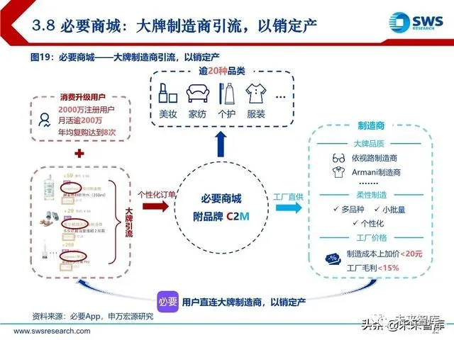 ◼ 我们根据各电商平台对品牌的依附程度将C2M分为附品牌C2M、自有品牌C2M、平台 型白牌C2M,附品牌类C2M主要依靠知名品牌制造商概念来引流,自有品牌C2M主要 吸引对自身品牌有信赖度的客群,平台型白牌C2M则面向平台上所有用户。