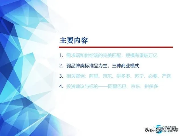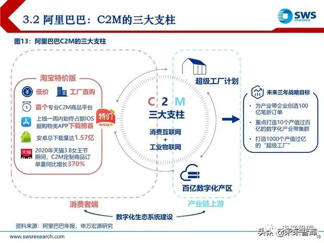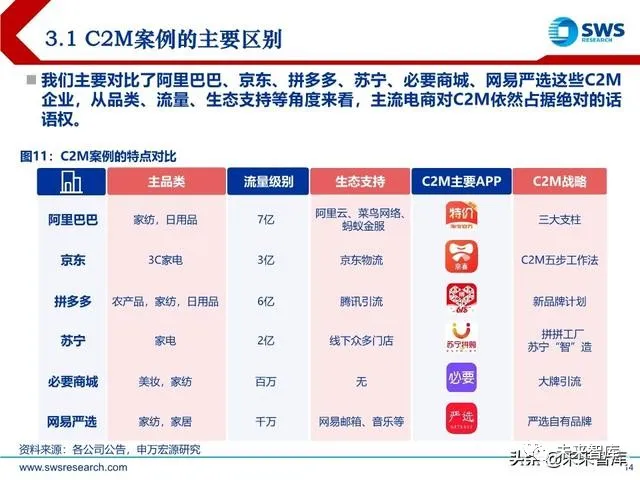 ◼ 从C2M的三类模式对比来看,我们认为平台型白牌C2M未来将会胜出,这主要得 益于其超级大的流量池,高流量可以汇聚更多的C端需求,进而使M端的生产更加 集约化,从而淘汰众多规模小的C2M平台。其次是海量的SKU,这会使更多的C 端消费者往该平台上集聚。主要的代表企业有阿里巴巴、京东和拼多多。