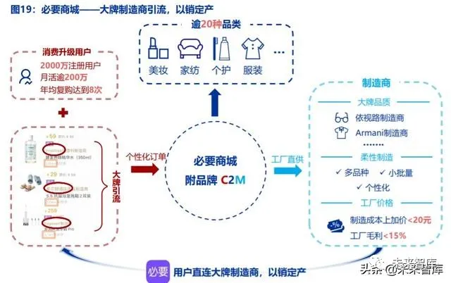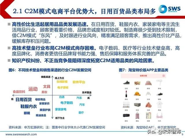 ◼ 高性价比生活起居用品品类发展迅速。在日用百货、鞋服内衣、家装家电等主流生 活用品行业,顾客更看重价格,品牌忠诚度相对较低。制造商很少受到技术限制, 借C2M模式“东风”,及时跟进行业风向,精准满足顾客需求,推出高性价比产品, 缓解库存积压问题。