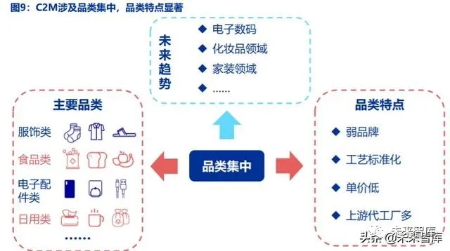C2M的品类目前主要集中在一些弱品牌化标准品,比如服饰类、食品类、电子配 件类等,其具备弱品牌化、工艺标准化、单价低、上游代工厂多等特点。