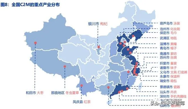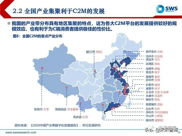 ◼ 我国的产业带分布具有地区集聚的特点,这为各大C2M平台的发展提供较好的规 模效应,也有利于为C端消费者提供极佳的性价比。
