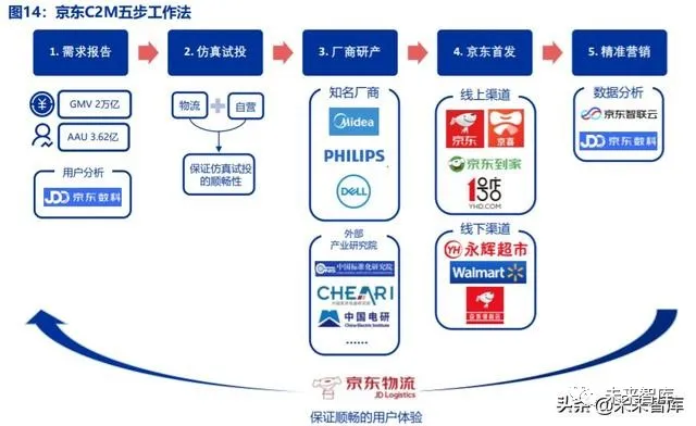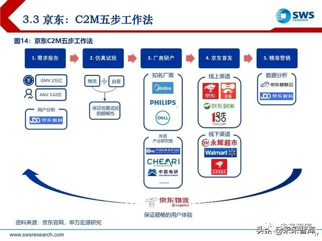 ◼ 京东:C2M五步工作法,从需求报告——仿真试投——厂商研产——京东首 发——精准营销,最后在京东自营物流的服务下为用户提供极佳的体验。