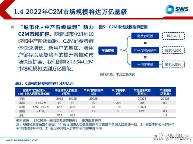 ◼ “城市化+中产阶级崛起”助力 C2M市场扩容。随着城市化进程加 速和中产阶级崛起,C2M消费者群 体快速增长。新用户的增加、老用 户留存以及复购率的提升将推动市 场快速扩容,我们测算2022年C2M 市场规模将达到万亿量级。