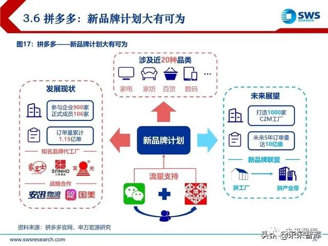 ◼ 拼多多:通过“新品牌计划”+“多多农园”,打造上千家C2M工厂和下沉农作 物基地,帮助工厂实现品牌化和推动农产品供应链的数字化改造,采用强大的拼 团基因为C端消费者提供极致性价比。
